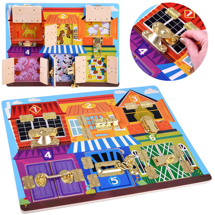 A gyerekeknek szánt szenzoros manipulációs tábla hat zárt zárral van felszerelve. Minden ajtó mögött állatok vannak elrejtve. Minden ajtó egy számmal van megjelölve, amely az ajtó mögött álló állatok számát jelzi.