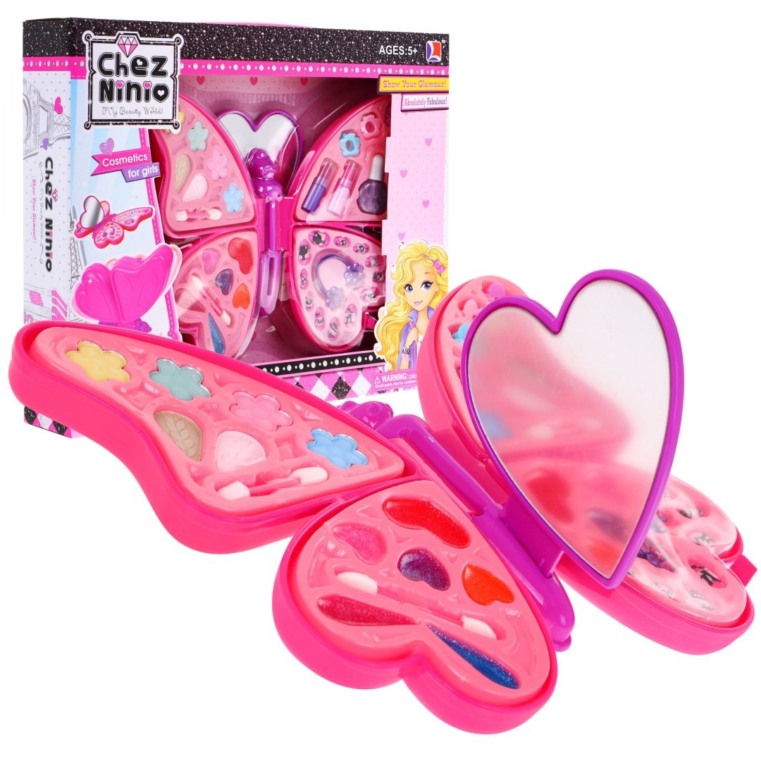 Gazdagon felszerelt kozmetikai készlet praktikus zárt dobozban, pillangó formájú. A készlet számos kozmetikai terméket tartalmaz, mint például: szemhéjfestékek, ecsetek, szájfények, rúzsok, körömlakkok, hajklipek és hajgumik. A gyermekkozmetikumokkal ellátott doboz a játék vége után zárható, nem foglal sok helyet.